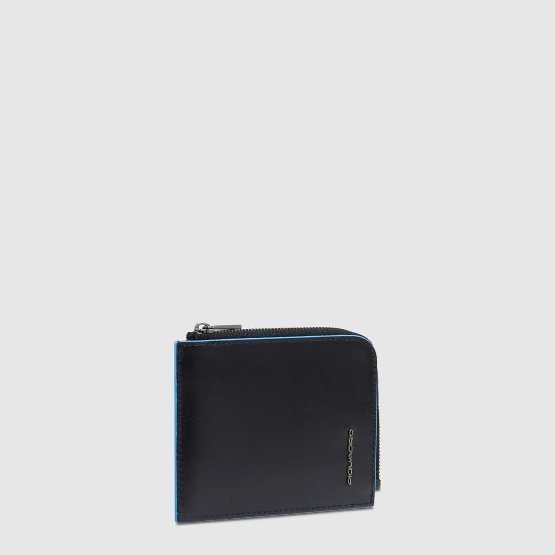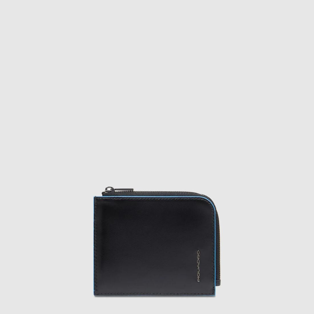 Portacarte Piquadro della linea Blue Square in pelle con rifiniture in azzurro, spazio per carte di credito con porta monete, schermato con protezione RFID Cod PP6860B2R-N