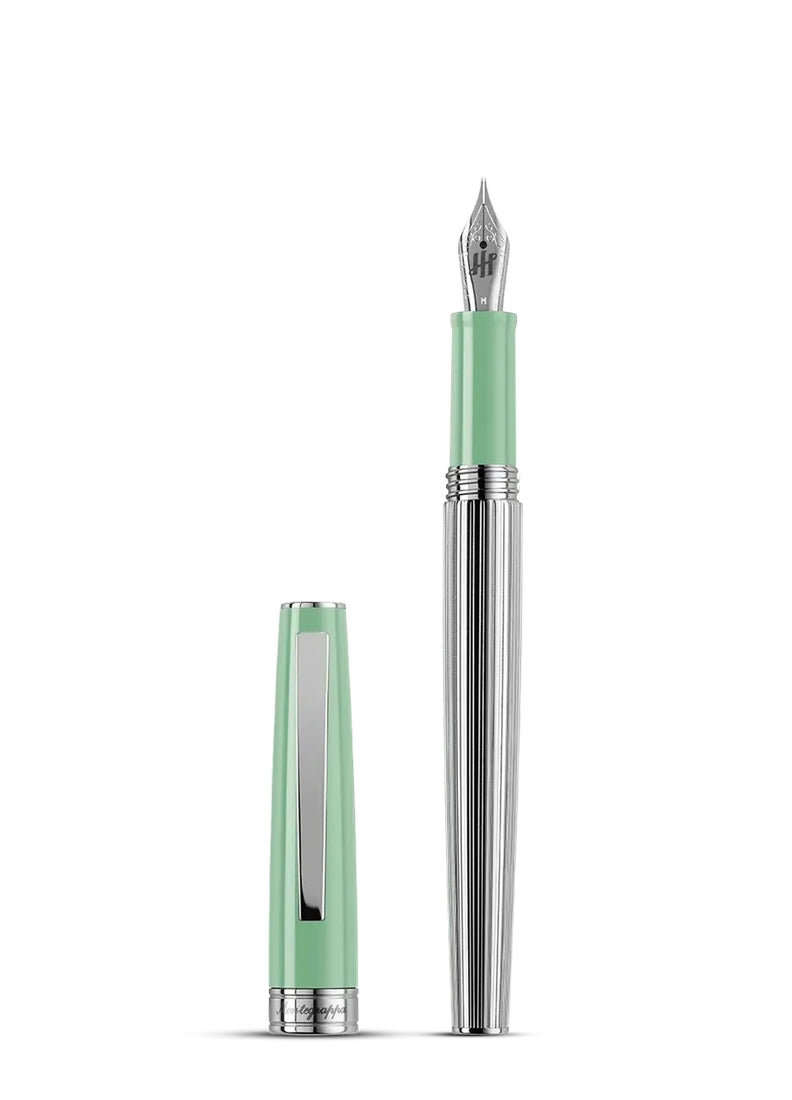 Penna stilografica Montegrappa Duetto Neo Mint della linea Armonia scafo in acciaio rigato e cappuccio in resina verde con minuterie in acciaio, Cappuccio a vite con logo e brand Montegrappa inciso nel collarino Cod ISA1M3AG