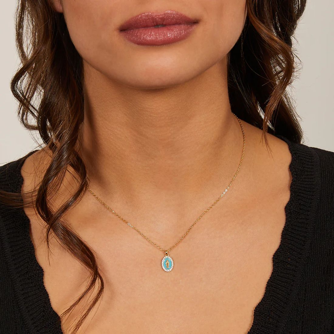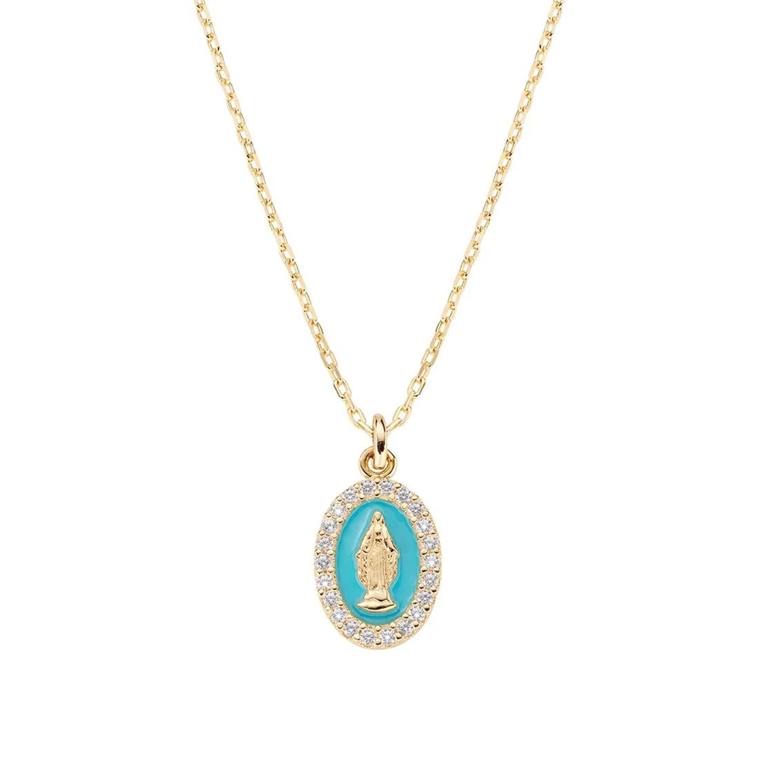 Raffinata e ricca di significato, questa collana da donna di Amen in argento 925 dorato presenta una piccola medaglia pendente raffigurante la Madonna Miracolosa su sfondo smaltato turchese , incorniciata da un bordo di zirconi bianchi che ne esaltano la luce e la spiritualità.