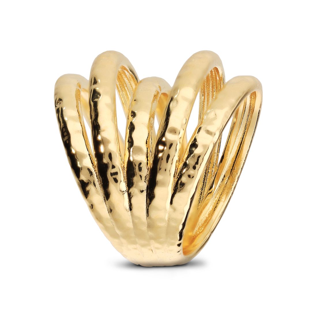 Questo anello Etrusca Gioielli da donna placcato oro 18 kt è un gioiello che unisce texture e struttura con eleganza. È composto da più fili sottili intrecciati a formare una fascia compatta e continua, tutti con finitura martellata, che conferisce una luminosità particolare ed effetti di luce dinamici, il design offre volume pur mantenendo leggerezza al dito.