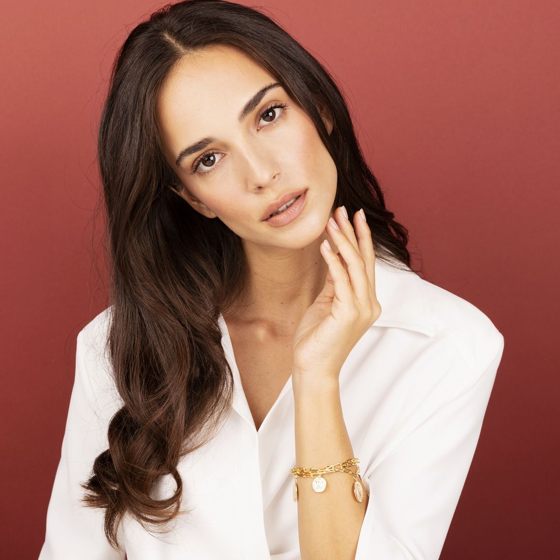 Bracciale Etrusca Gioielli da donna combina femminilità e carattere: è realizzato con più fili sottili intrecciati che si uniscono a una catena rolo allungata, creando volume e leggerezza allo stesso tempo. Sospeso in modo elegante c’è un charms a moneta, un dettaglio classico che richiama simboli di fortuna e forma. La finitura dorata e la texture lucida danno vitalità al gioiello, che si muove con grazia sul polso.