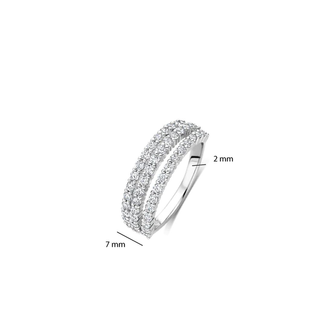 Anello Ti Sento Milano da donna in argento si distingue per il suo design elegante e ricco di brillantezza. Il gioiello è composto da tre fasce parallele, ciascuna impreziosita da scintillanti zirconi. La sottile spaziatura tra le fasce crea un delicato effetto bombato che dona profondità e movimento al design, amplificando la luce riflessa dalle pietre.