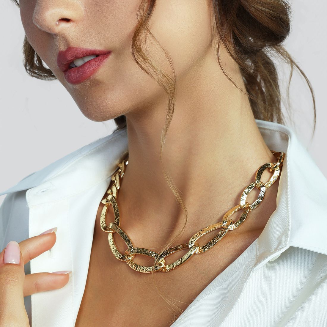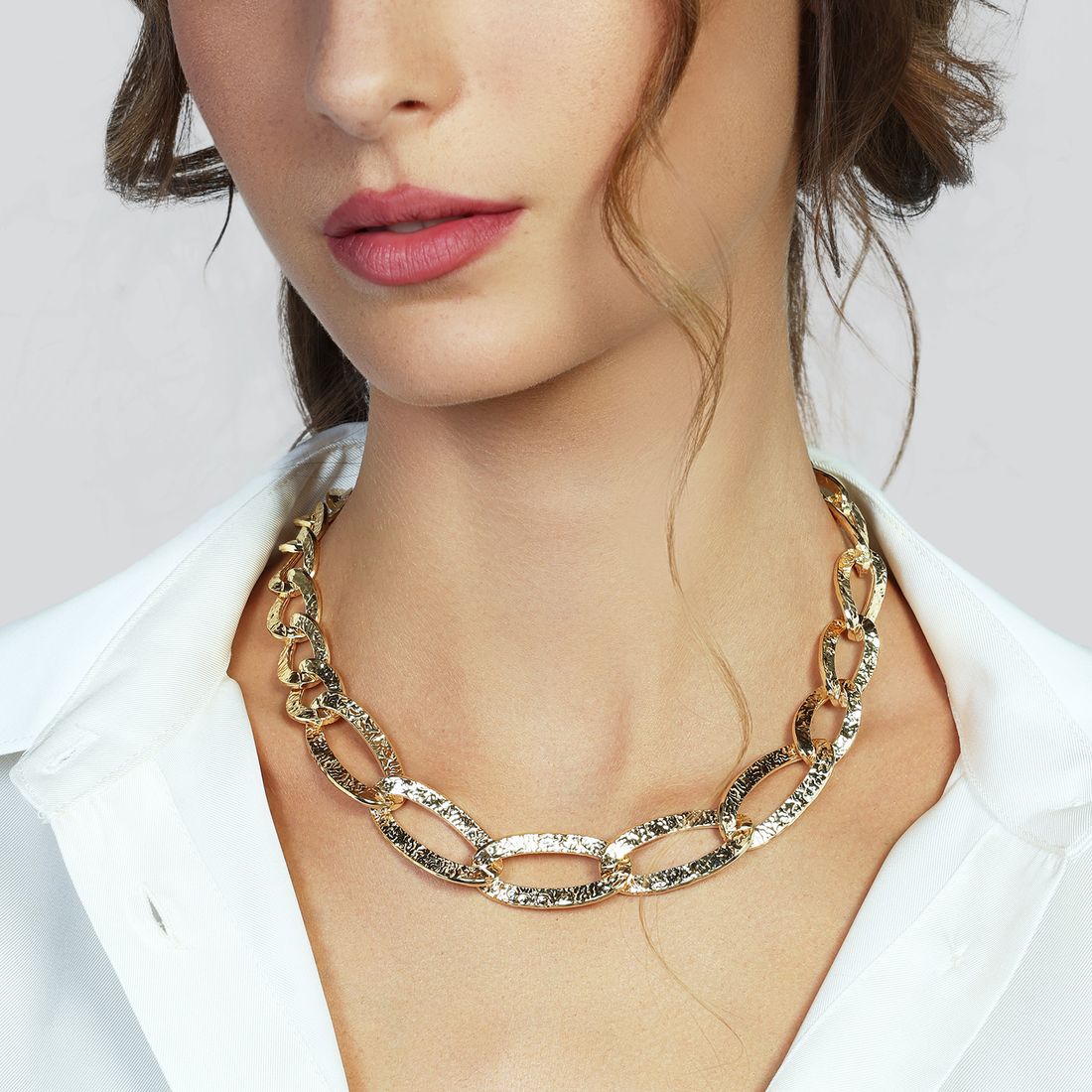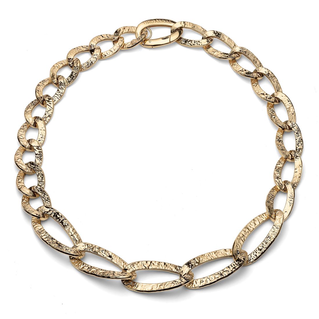 Collana da donna Unoaerre in argento dorato con maglie ovali piatte dal raffinato effetto martellato. Il design contemporaneo è valorizzato da un maxi moschettone con logo, che aggiunge un tocco distintivo.
