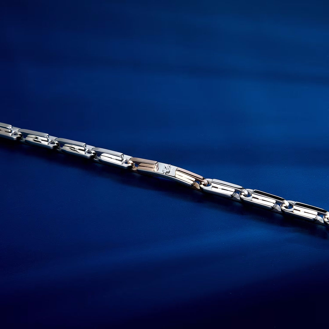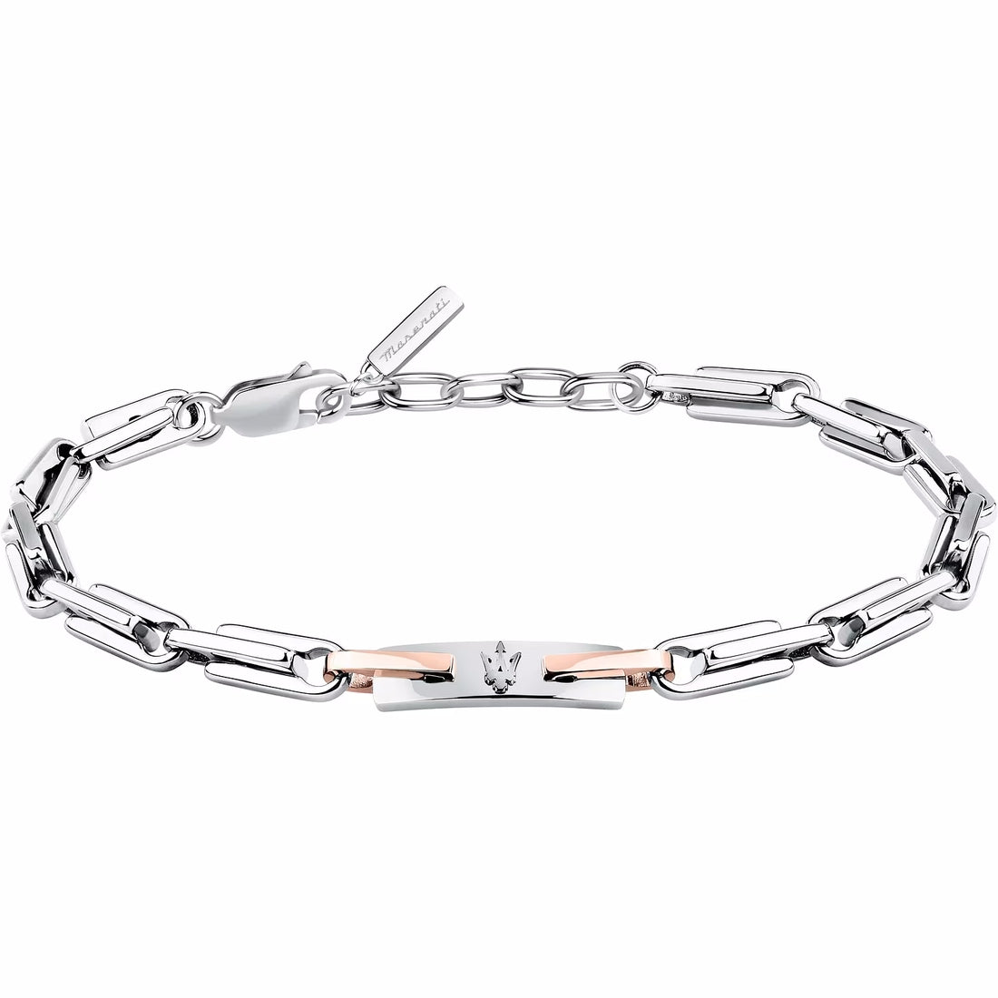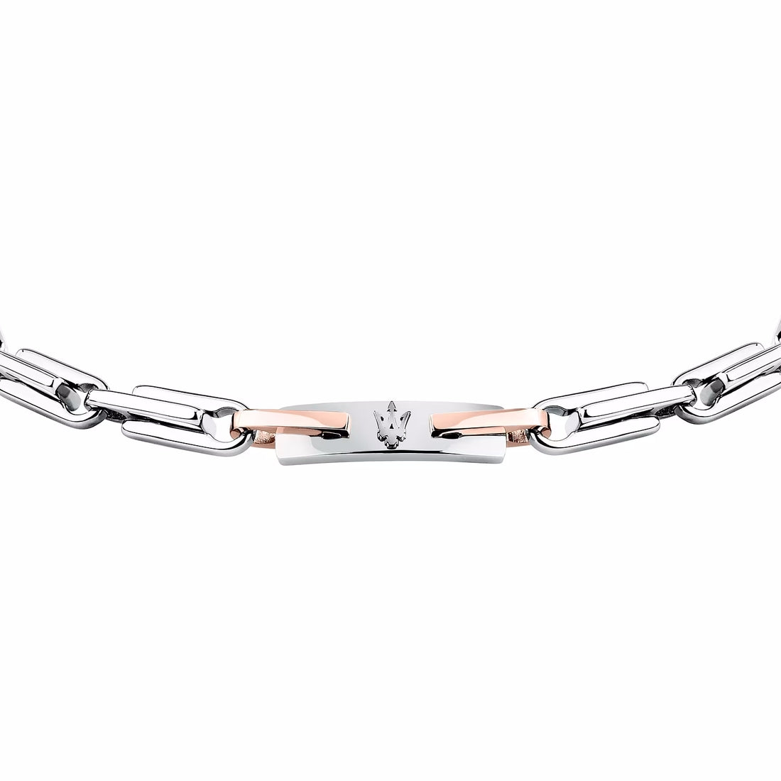 Bracciale da uomo Maserati che combina eleganza e sportività in un design raffinato. Realizzato in acciaio inossidabile, questo modello si presenta con finitura lucida e dettagli in dorati rosa. Al centro del bracciale, una targa con il logo Tridente blu aggiunge un tocco distintivo e riconoscibile. La misura indicata è 19,5 + 3 cm