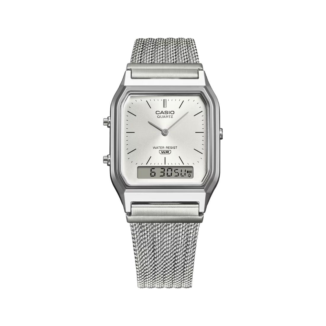 Casio Vintage AQ-230EM-7A unisex unisce lo stile vintage alla funzionalità moderna: la cassa da 30mm e il cinturino a maglia in acciaio conferiscono un look elegante e discreto, perfetto anche per outfit formali.