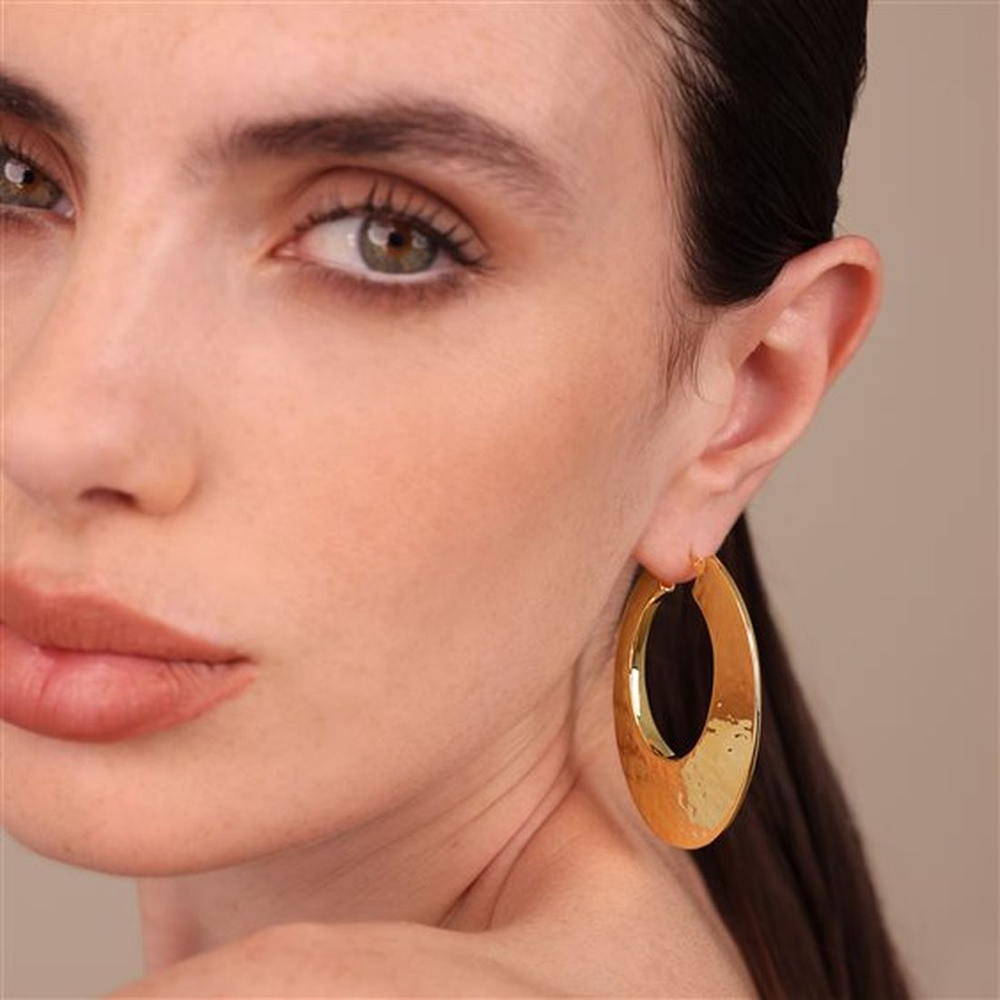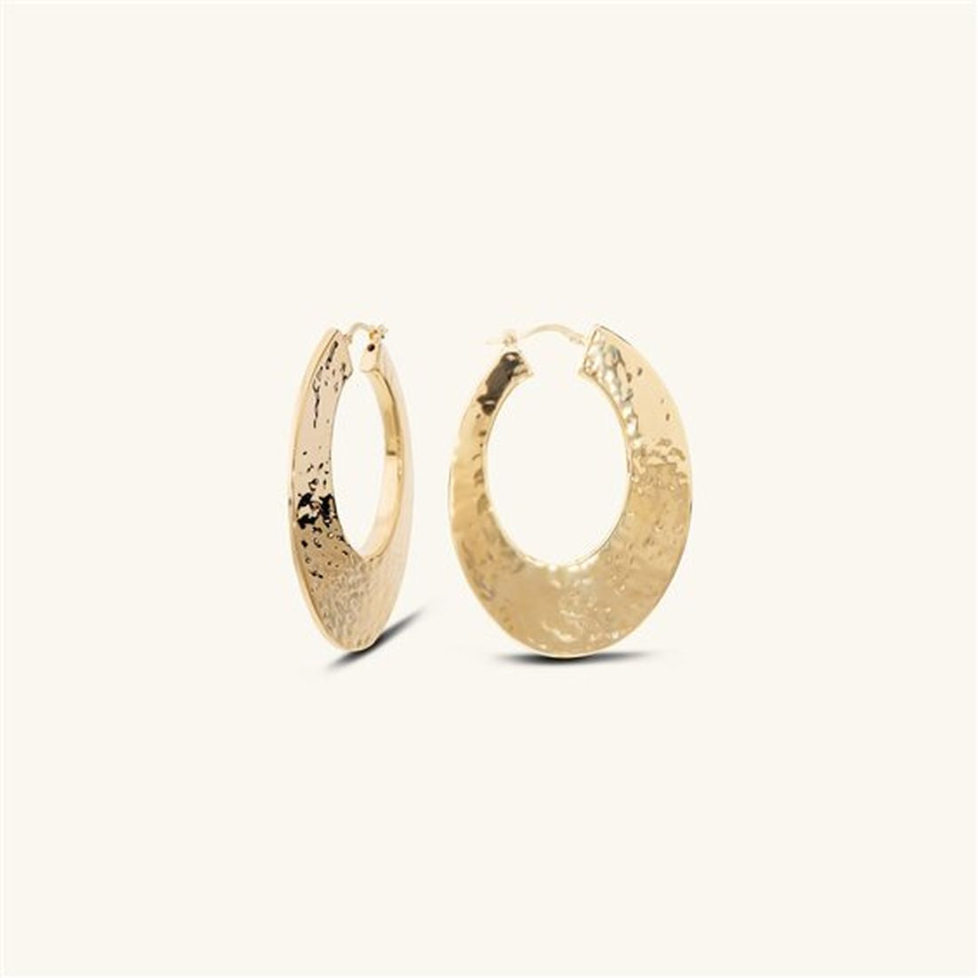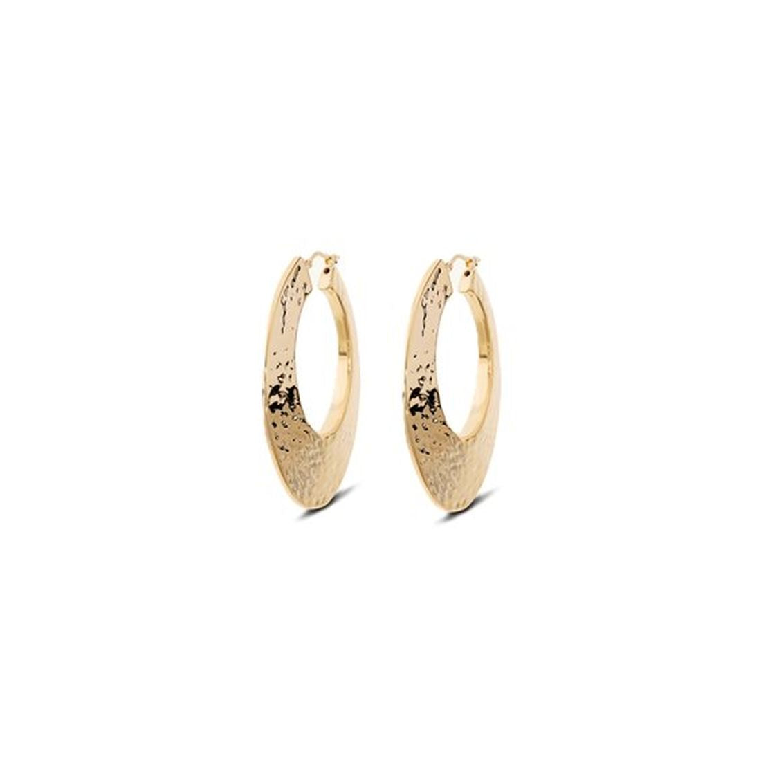 Gli orecchini da donna a cerchio Etrusca Gioielli combinano eleganza pura e artigianalità. Realizzati in lega dorata con finitura placcata oro 18kt presentano una forma allungata che scende con grazia dal lobo, e una superficie martellata che cattura e riflette la luce con un effetto vibrante.