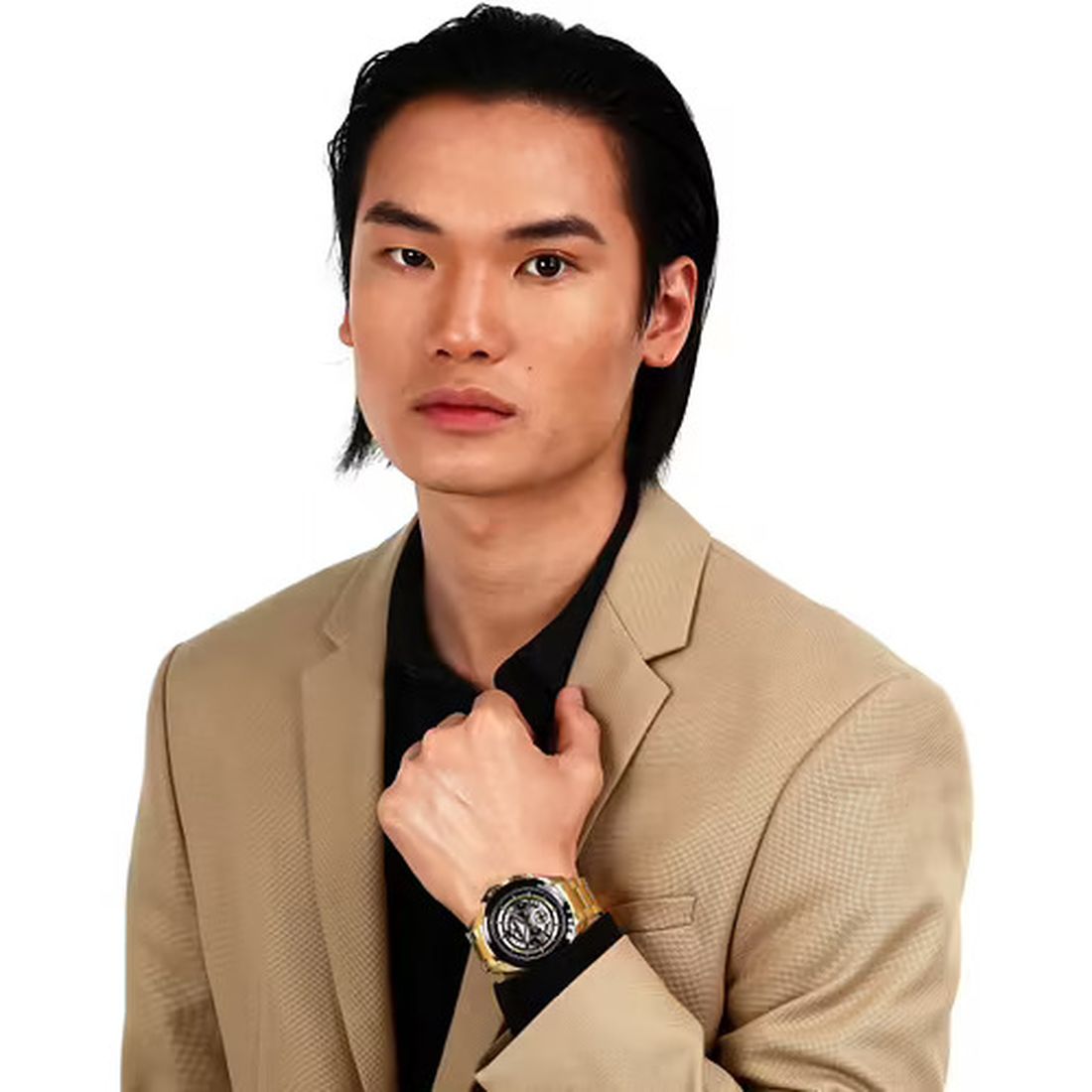 Orologio Maserati della linea Traguardo è un segnatempo che unisce eleganza, precisione e spirito audace. La cassa da 45 mm in acciaio dorato, cattura lo sguardo grazie al contrasto con la lunetta nera e il design scheletrato del quadrante, che rivela la complessità del cronografo sottostante.