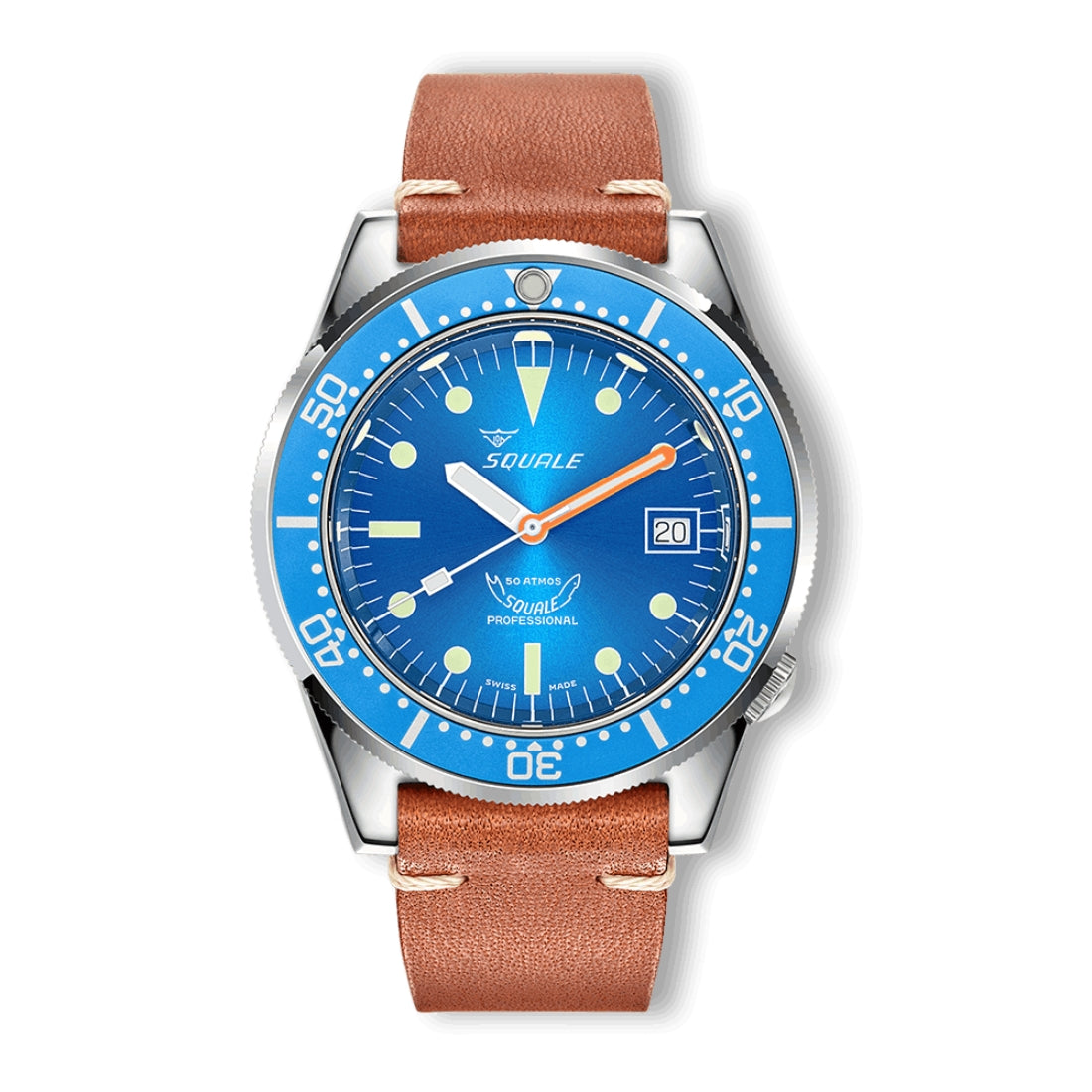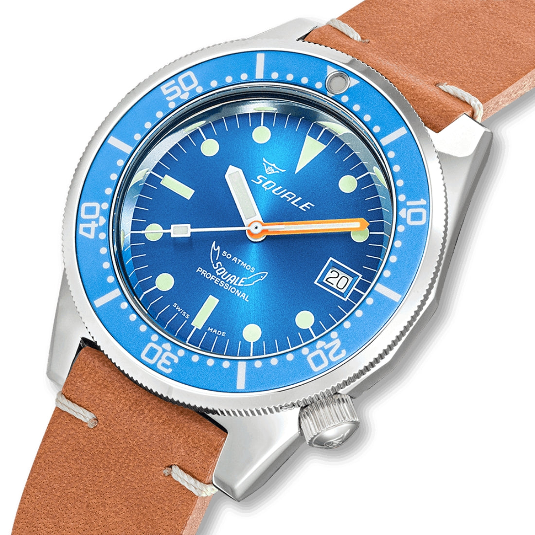 Orologio Squale della linea 1521 la collezione più famosa di questo brand tanto da diventarne il simbolo, versione con quadrante e ghiera blu oceano, datario a ore tre e lancetta dei secondi arancione. Cassa da 42mm di diametro con finitura lucida, cinturino in pelel marrone chiaro e una resistenza fino a 500 metri di profondità. cod 1521OCN.PC