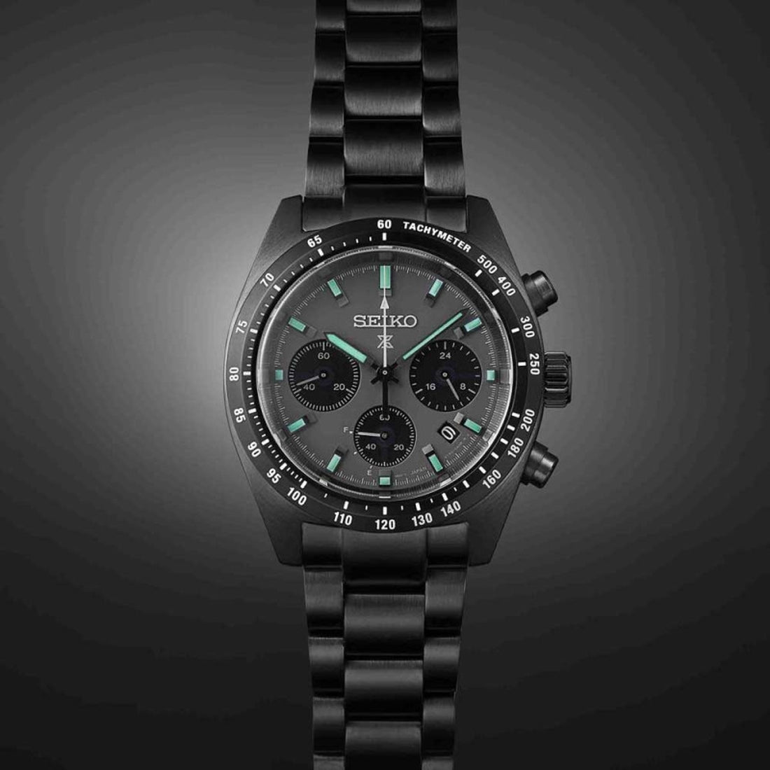 Seiko Prospex Speedtimer SSC917P1 versione Nigth Vision con cassa e bracciale trattati IP nero e indici turchesi, orologio da uomo cronografo con movimento al quarzo a ricarica solare, cassa da 39mm in acciaio, vetro zaffiro, resistente 100mt.