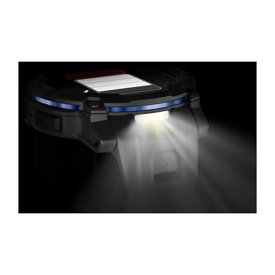 La cassa da 50 mm in resina rinforzata è completata da vetro minerale trattato e cinturino in silicone integrato, garantendo resistenza agli urti e impermeabilità fino a 10 ATM (100 metri). Tra le novità di questa generazione troviamo la torcia LED integrata e la possibilità di aprire la cassa tramite bulloni frontali, rendendo l’orologio più facilmente riparabile dai tecnici Garmin.