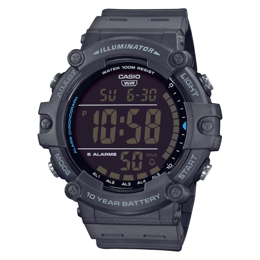 Orologio Casio AE-1500WH-1AVEF della linea Collection digitale multifunzione con ampio display positivo ideale per una immediata visualizzazione. Cassa da 51,2mm resistente fino a 10 bar in resina grigia scuro.
