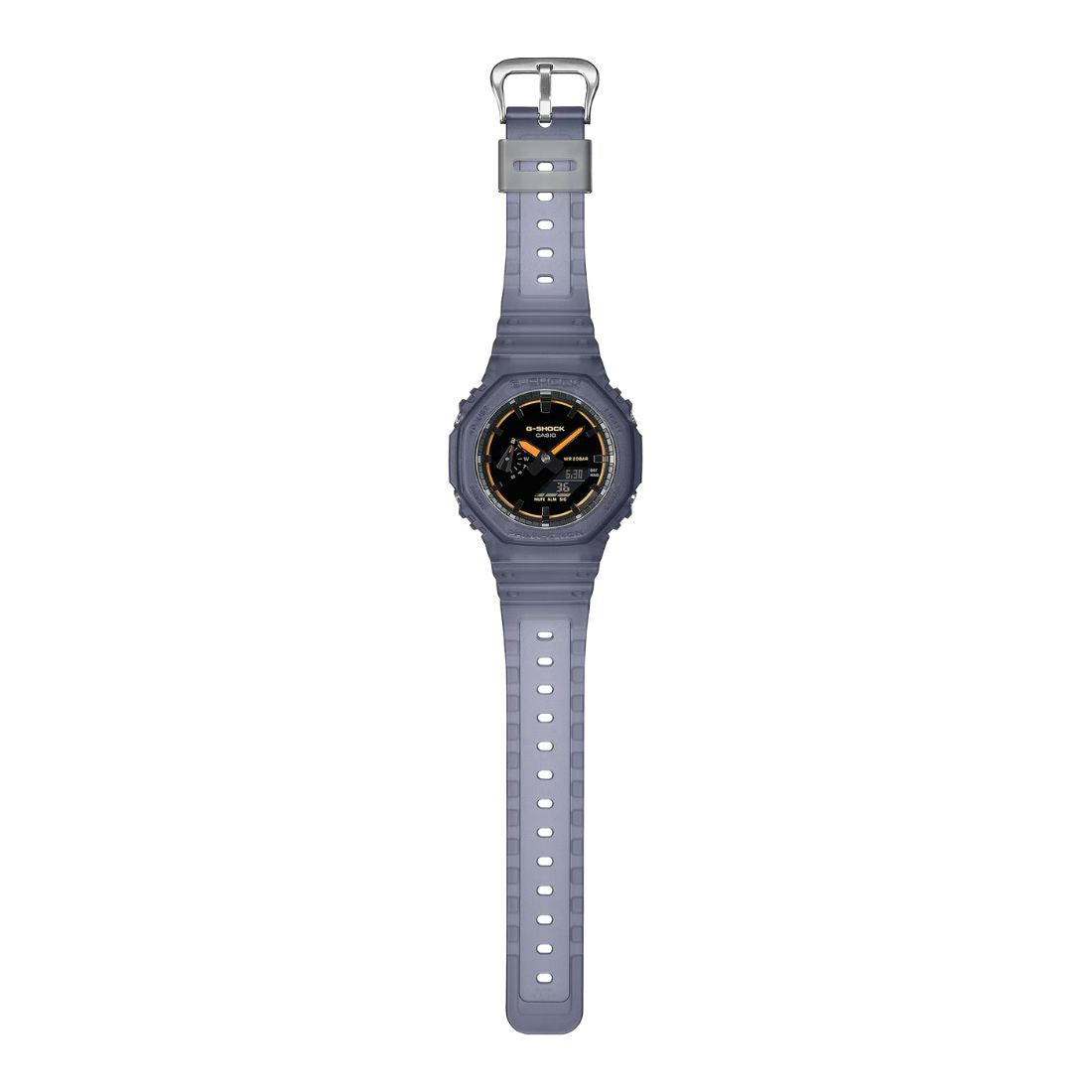 Il carattere distintivo di questo modello continua nel cinturino traslucido con finitura opaca, pensato per evocare la nebbia delle macchine del fumo e offrire una sensazione visiva e tattile completamente nuova. Il risultato è un orologio dal look innovativo, che unisce design all’avanguardia e la leggendaria resistenza agli urti G-Shock.