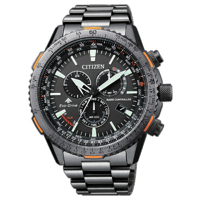 Orologio Citizen CB5007-51H radiocontrollato in acciaio trattato PVD nero con finiture arancio, ghiera girevole con funzioni di regolo calcolatore.