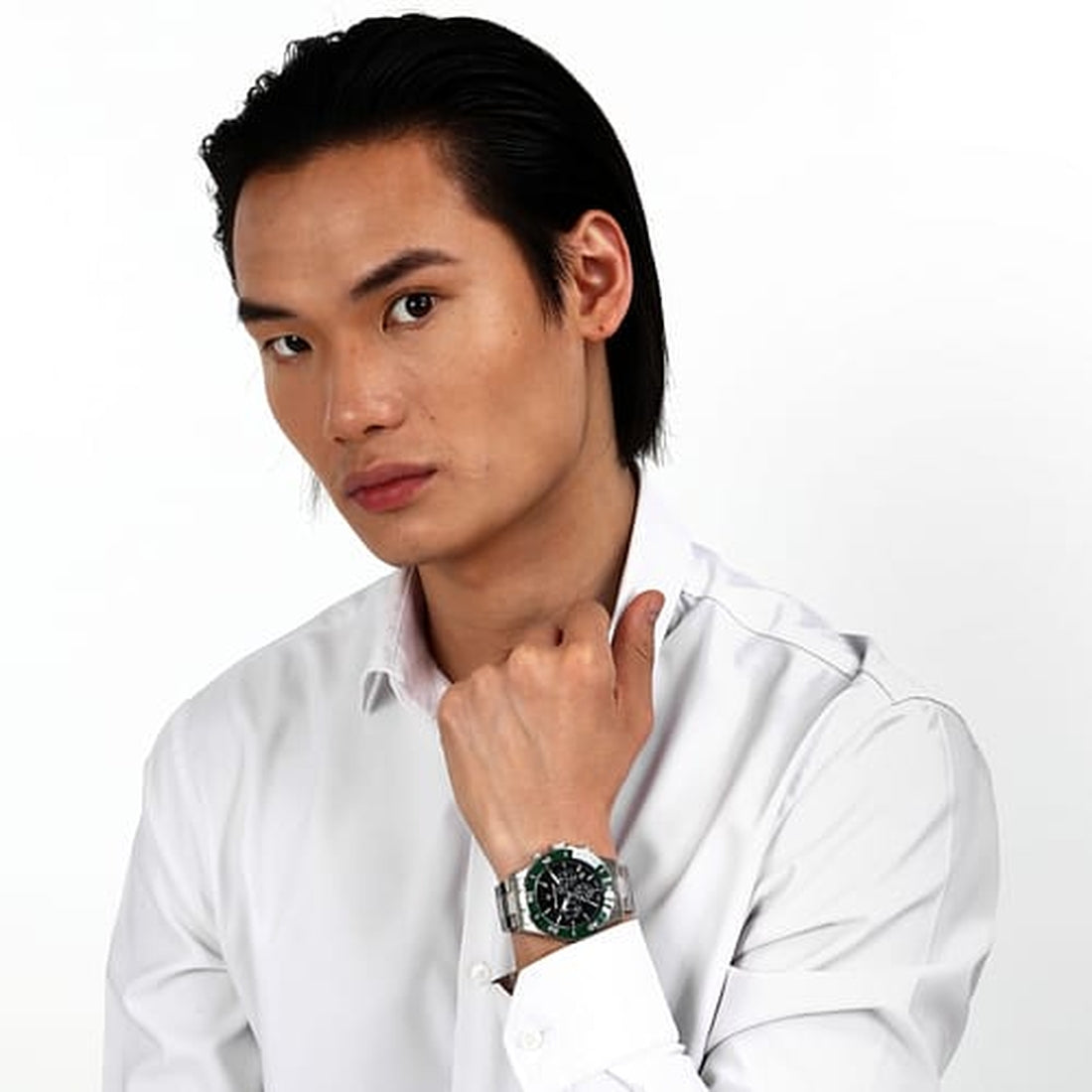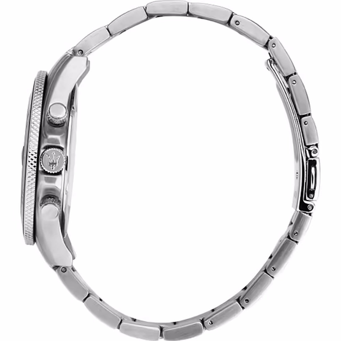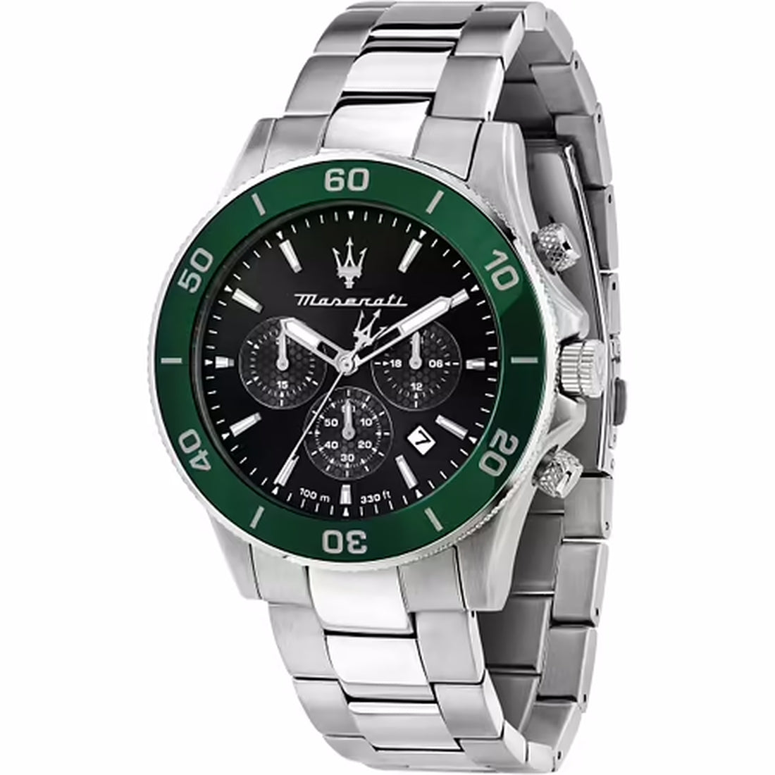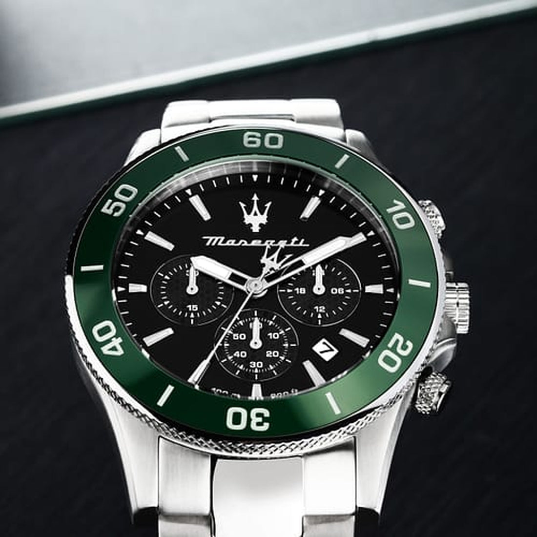Orologio Maserati Competizione cronografo da uomo con quadrante nerocon indici silver, cassa in acciaio 43 mm con lunetta ceramica verde, e bracciale in acciaio . Movimento Miyota JS25, datario, funzione cronografo, vetro minerale e impermeabilità fino a 100 m.