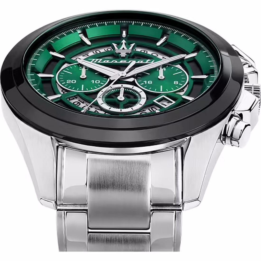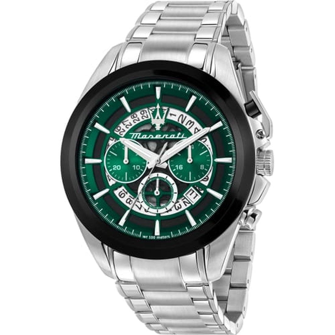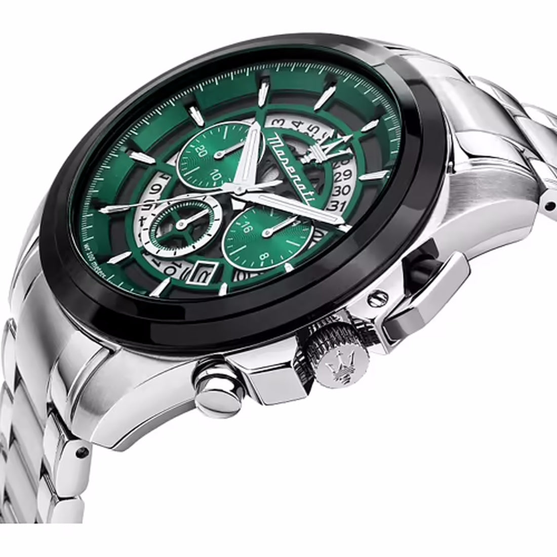 Orologio Maserati della linea Traguardo è un segnatempo che unisce eleganza, precisione e spirito audace. La cassa da 45 mm in acciaio, cattura lo sguardo grazie al contrasto con la lunetta nera e il design scheletrato del quadrante, che rivela la complessità del cronografo sottostante.