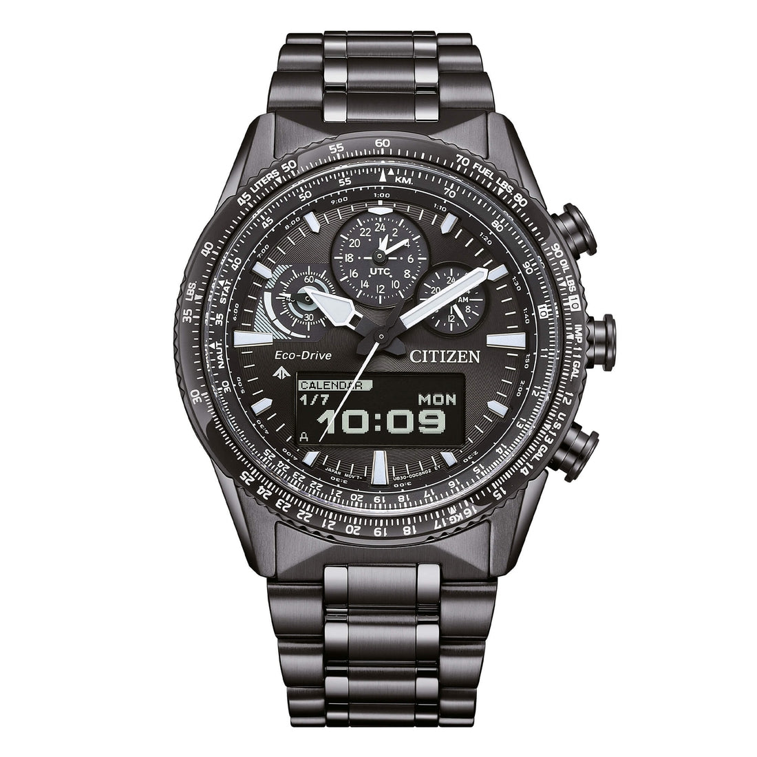 Orologio Citizen Promaster Sky JV2005-58E cronografo con regolo calcolatore dedicato all'aviazione in acciaio trattato IP nero abbinato al quadrante nero con nuovo movimento ibrido ad indicazione dell'ora analogica e dati su display digitale ideale per soddisfare le esigenze di calcolo dell'areonautica.
