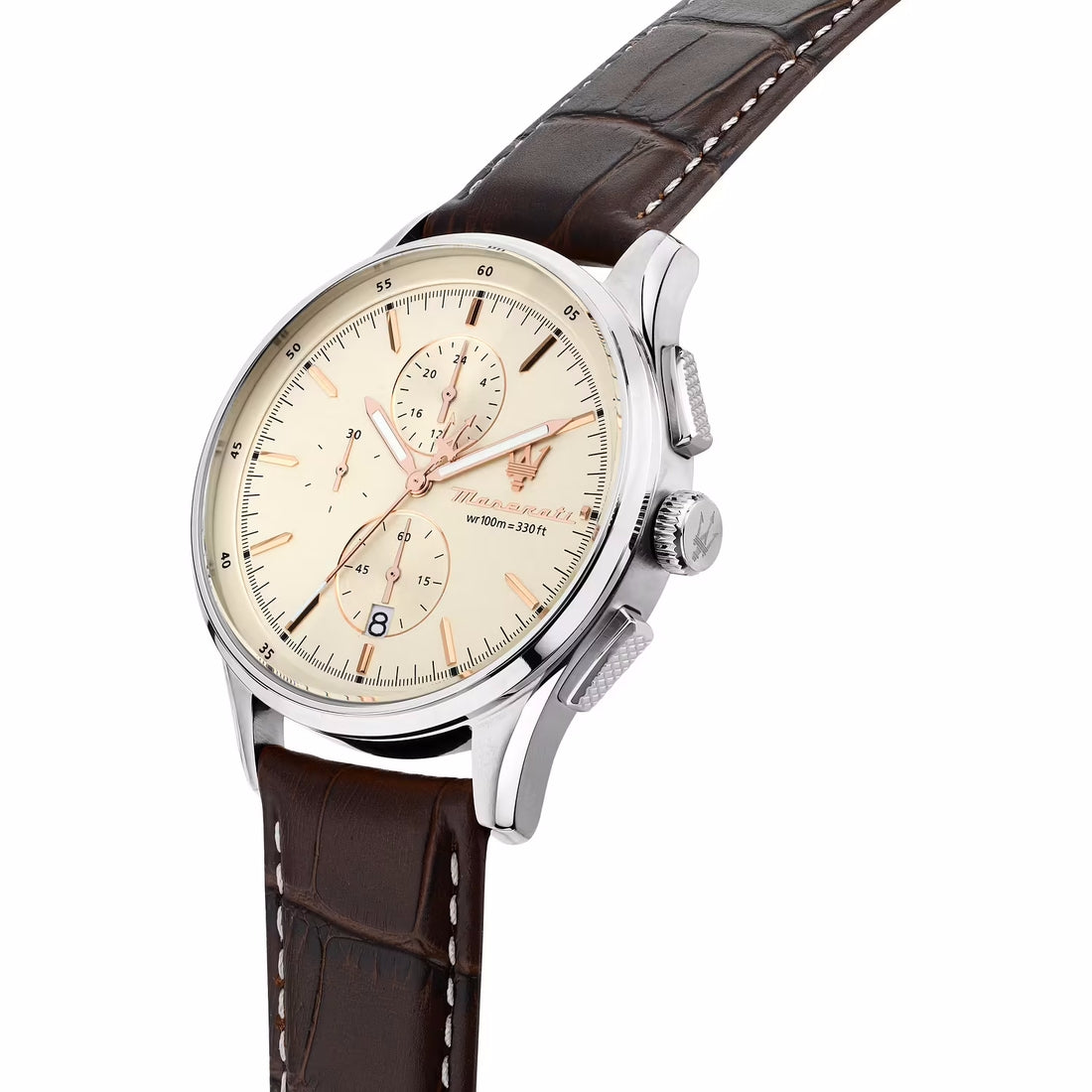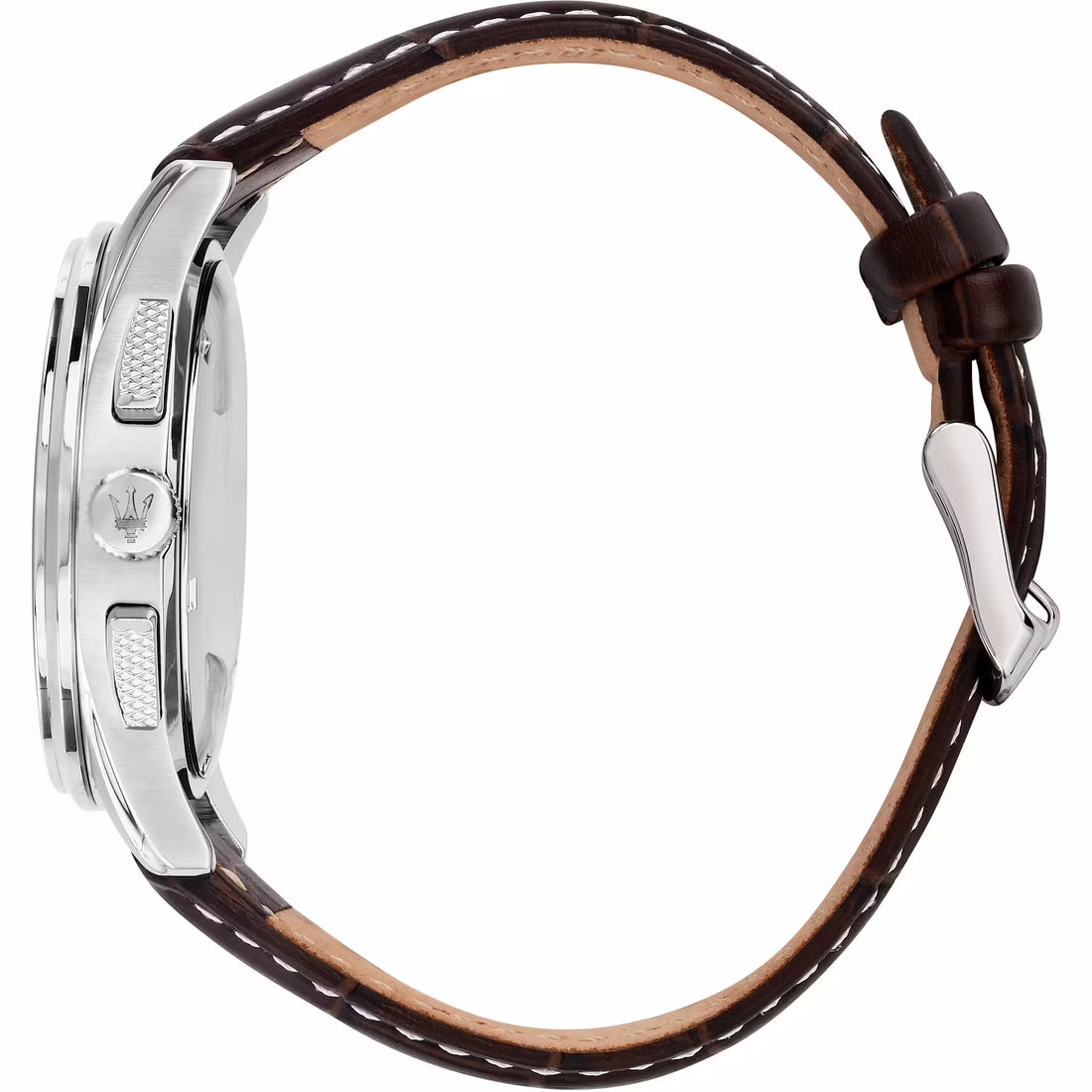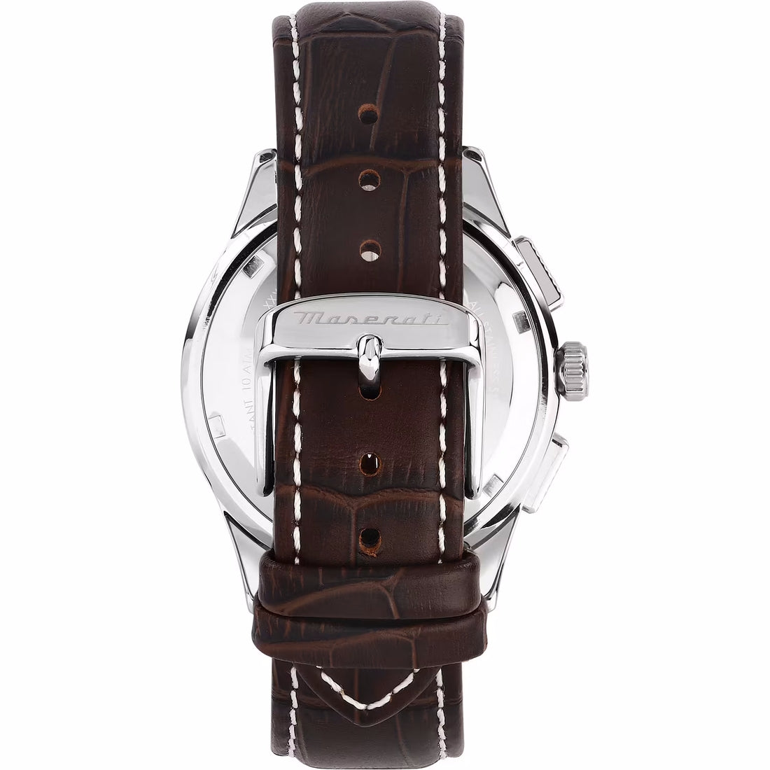 L'orologio Maserati Sorpasso Cronografo è l'espressione di una raffinatezza senza tempo, perfetta per chi apprezza un design classico con un tocco di moderna sportività. La cassa in acciaio lucido si abbina armoniosamente al cinturino in vera pelle marrone con cuciture a contrasto, conferendo un look distinto e versatile.