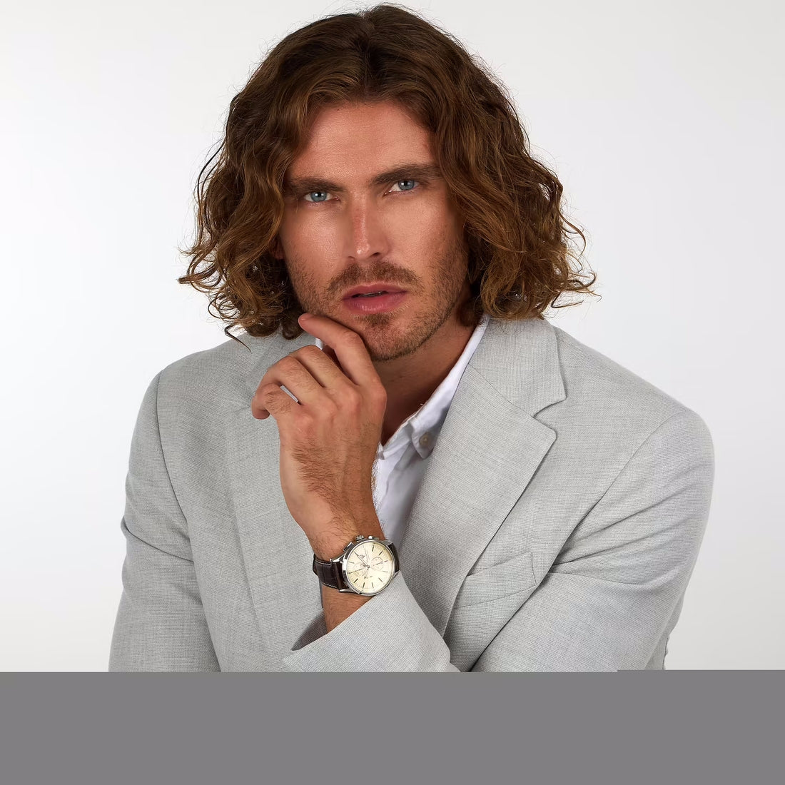 Il quadrante color crema è il fulcro di questo modello, con dettagli color oro rosa su indici, lancette e i tre contatori del cronografo, che aggiungono un tocco di calore e lusso. Il logo del Tridente è discretamente posizionato sotto le ore 12. Impermeabile fino a 100 metri. Cod R8871624010