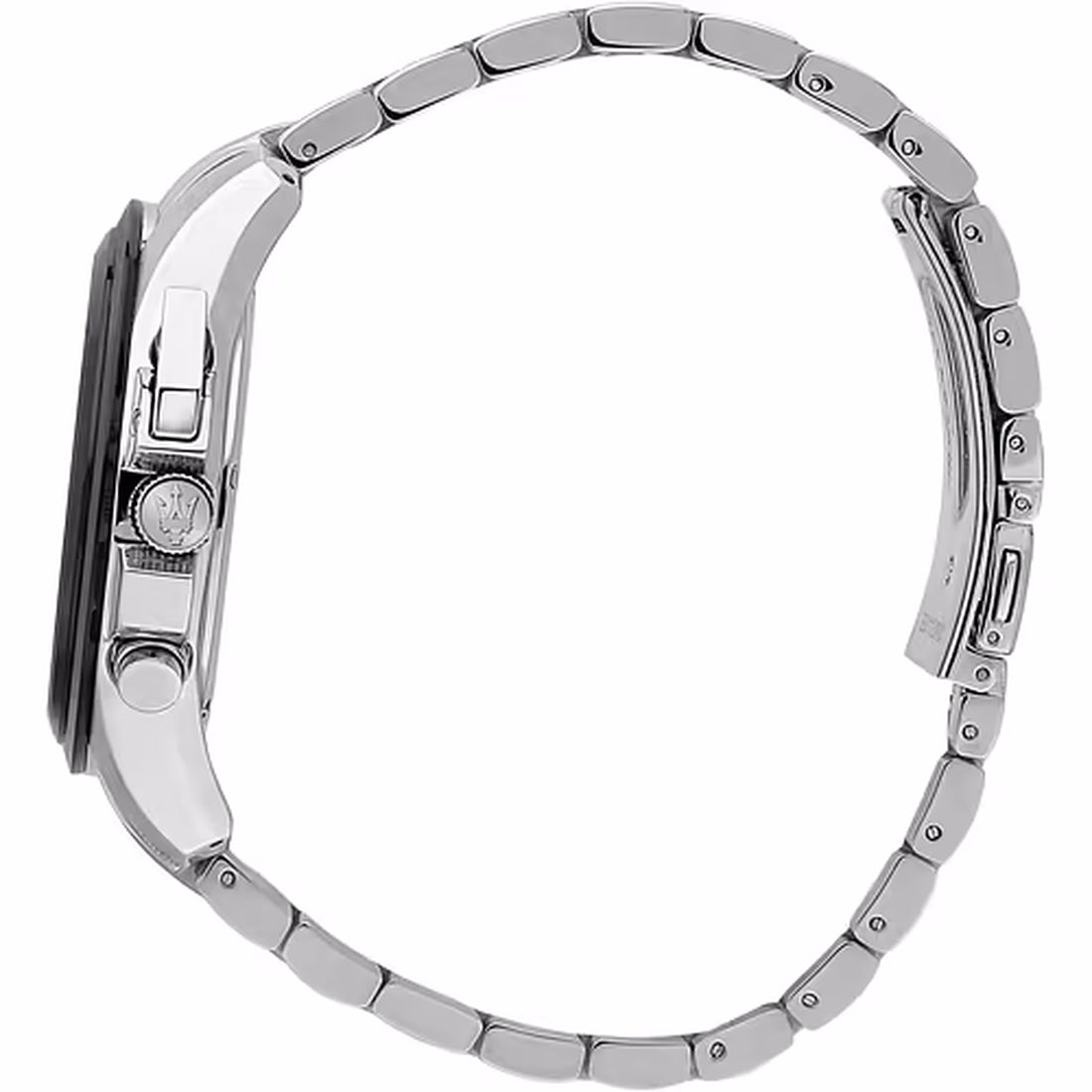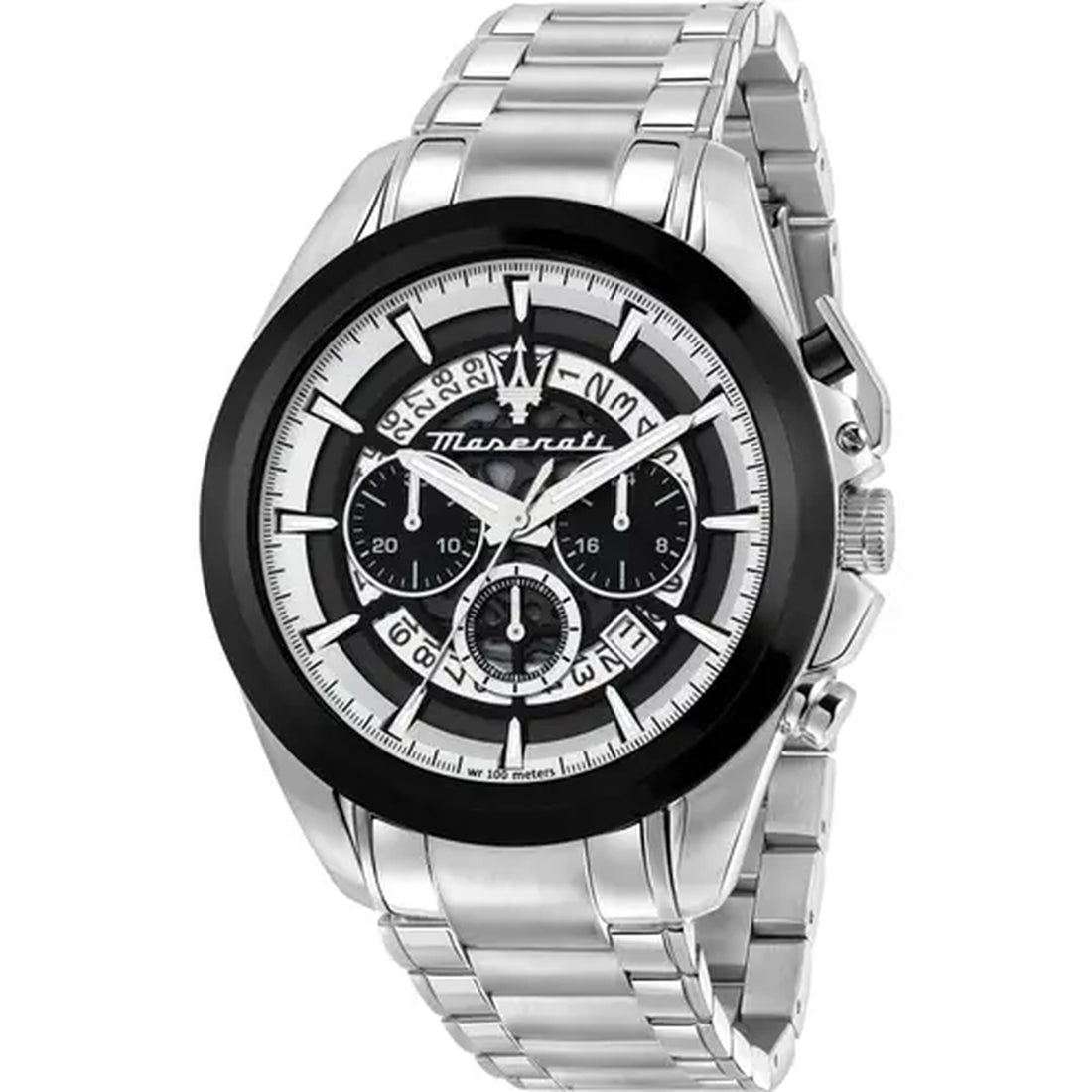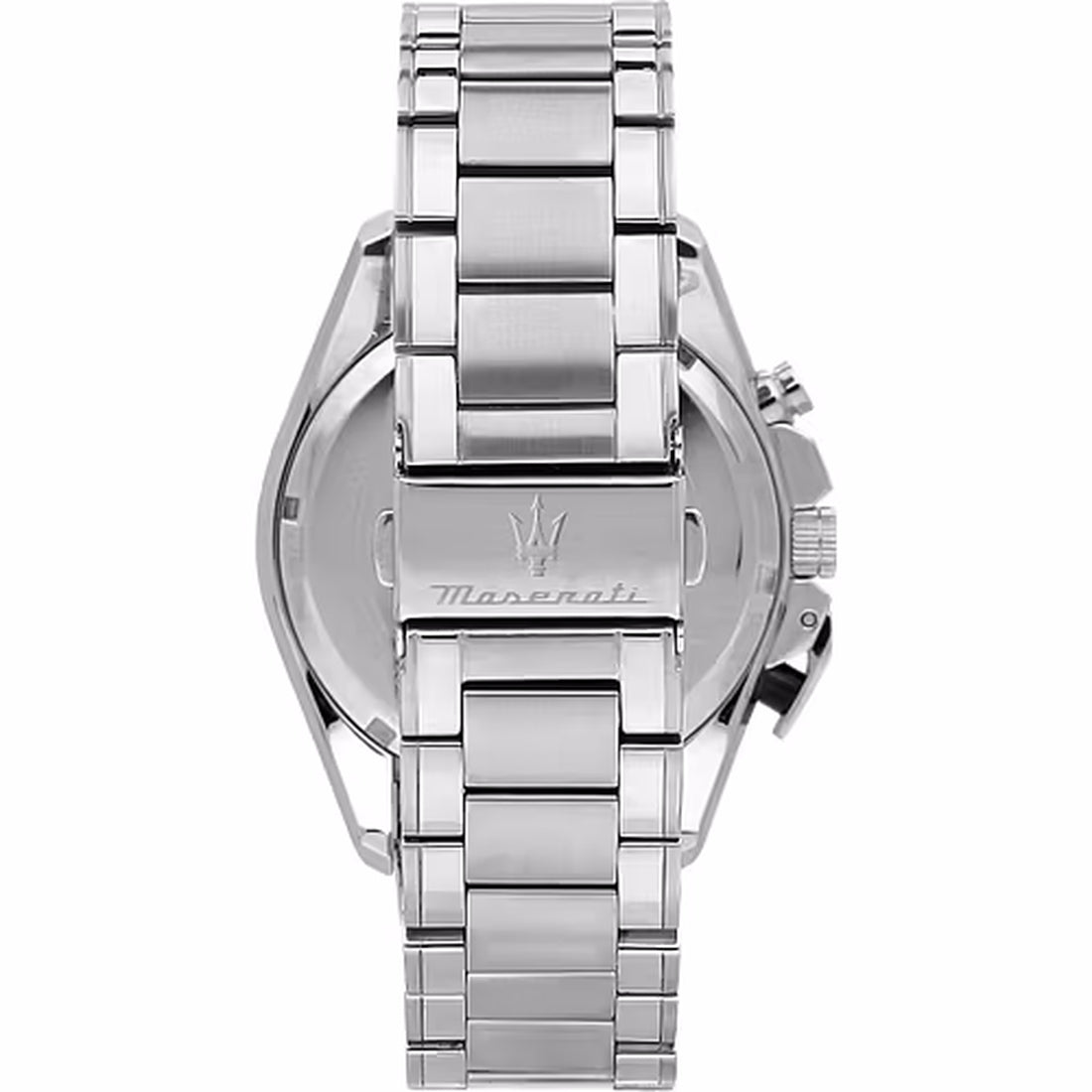 Orologio Maserati della linea Traguardo è un segnatempo che unisce eleganza, precisione e spirito audace. La cassa da 45 mm in acciaio, cattura lo sguardo grazie al contrasto con la lunetta nera e il design scheletrato del quadrante, che rivela la complessità del cronografo sottostante. cod R8873612059
