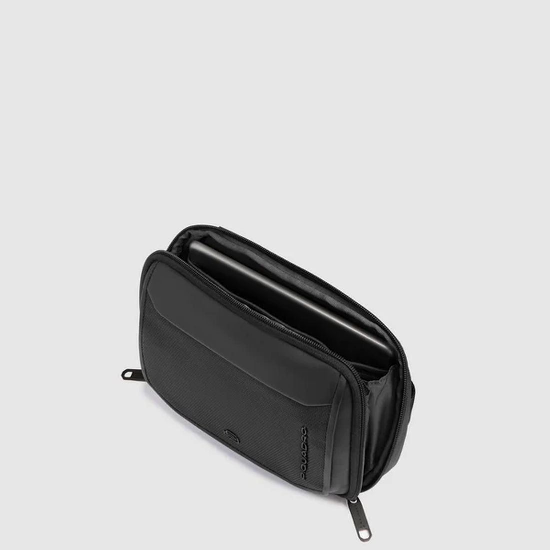 Borsello a tracolla Piquadro orizzontale da uomo per iPad®mini in tessuto riciclato e pelle con tasca per CONNEQU 4.0 e protezione RFID. Cod CA6932S143-N