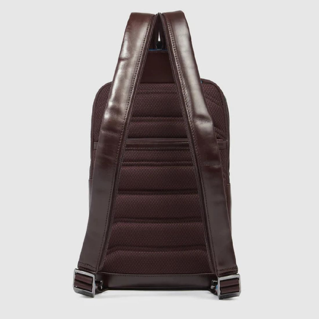 Zaino monospalla Piquadro della linea Blue Square in pelle Tablet 8,3" (iPad Mini, Samsung, Xiaomi) con protezione anti frode RFID, gli spallacci si uniscono e dividono in base a come vuoi indossarlo. - Cod CA6589B2-M