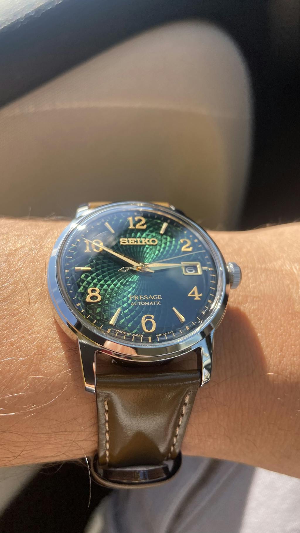 Orologio elegante Seiko Presage SRPE45J1 della linea Cocktail con quadrante di un magnifico color verde rifinito con un disegno radiale e indici dorati. Cinturino in pelle di vitello con deploiante.