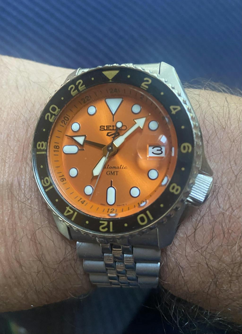 Orologio Seiko 5 sports da uomo SSK005K1 con movimento automatico e funzione di GMT, indicazione di un secondo fuso orario tramite la lancetta di colore nero.