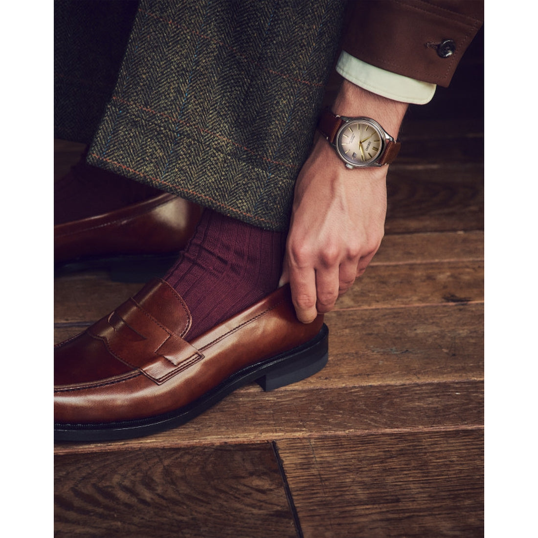 Le sfere e gli indici curvi seguono perfettamente la bombatura del vetro zaffiro a doppia cupola, enfatizzando l’armonia del quadrante. La cassa compatta da 36 mm richiama lo stile degli anni ’70 è abbinata a un cinturino in pelle di alta qualità rendendo l'orologio comodo ed elegante, per un look rétro senza tempo.