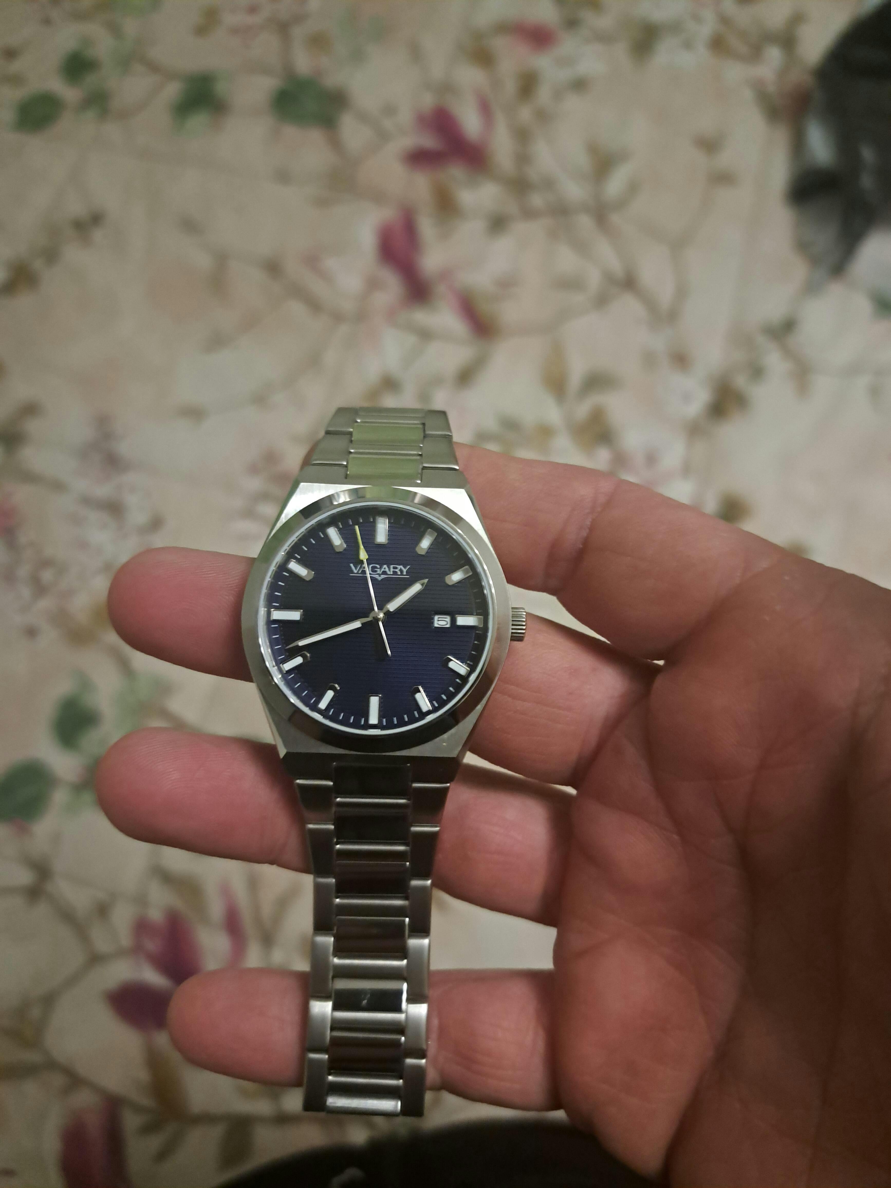 Orologio da uomo Vagary by Citizen con quadrante blu scuro a righe e indici della collezione Timeless. Cassa da 38mm, bracciale in acciaio e resistenza all'acqua 50mt. movimento al quarzo. Cod IB9-719-75