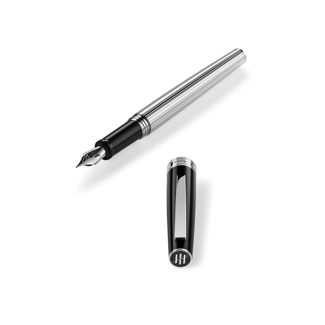 Penna stilografica Montegrappa Duetto Black della linea Armonia scafo in acciaio rigato e cappuccio in resina nera con minuterie in acciaio, Cappuccio a vite con logo e brand Montegrappa inciso nel collarino Cod ISA1M3AC